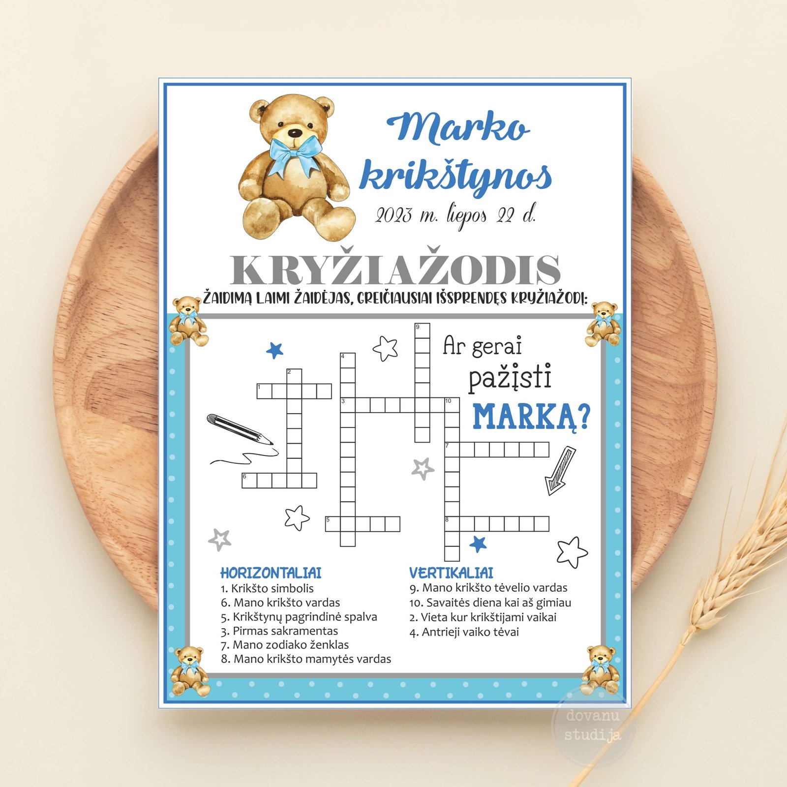 Žaidimas, kurio metu reikia spėti ir įrašyti susijusius žodžius su švente, krikštijamu vaikučiu. Žaidimą laimi, greičiausiai surašęs teisingus atsakymus. Nepamirškite laimėtojo apdovanoti originaliu prizu!