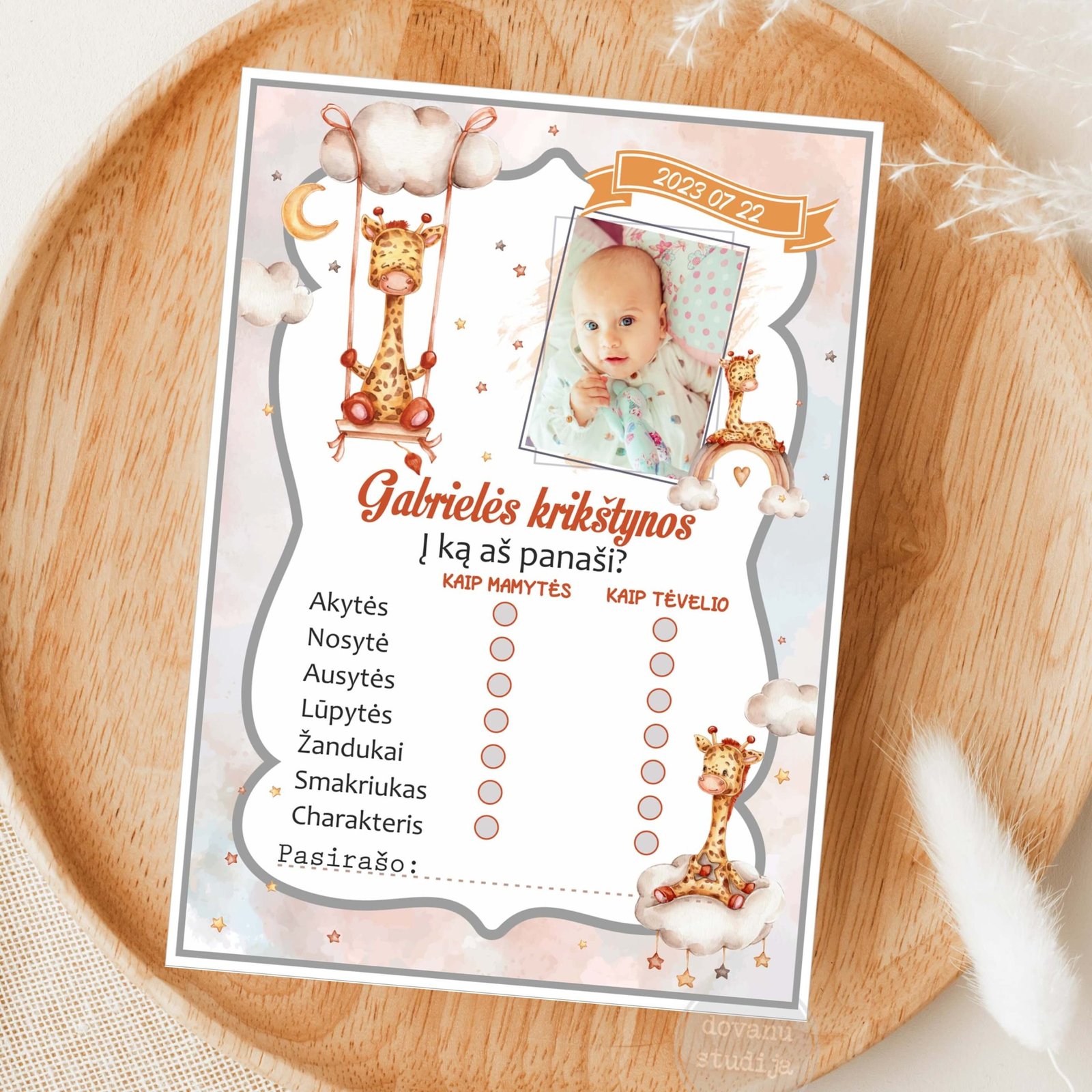 Girdėtos frazės: „tėčio vaikas”, „mamos vaikas”, „koks panašus(-i) į mamytę ar tėvelį”. Šios kortelės taps ilgaamžiu prisiminimu, padėsiančiu užfiksuoti visų svečių įžvelgtus panašumus tarp vaikučio ir tėvelių!