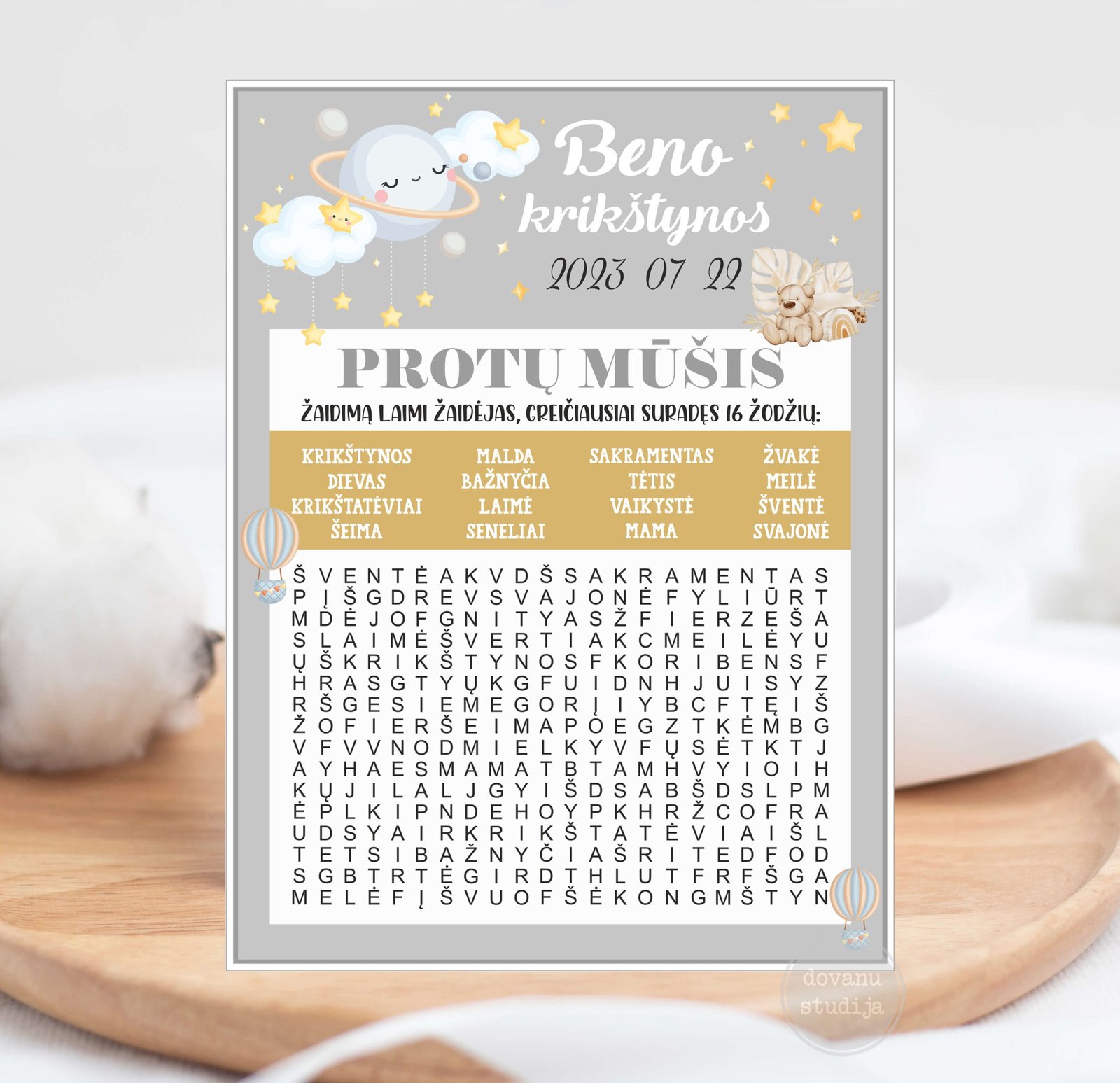 Protų mūšis – žaidimas, kuris įtrauks ir vaikus, ir suaugusius šventės svečius. Tikslas per sutartą laiką – surasti paslėptus, su švente susijusius žodžius. Puikiai papildysite žaidimą, jei nepamiršite laimėtojo apdovanoti.