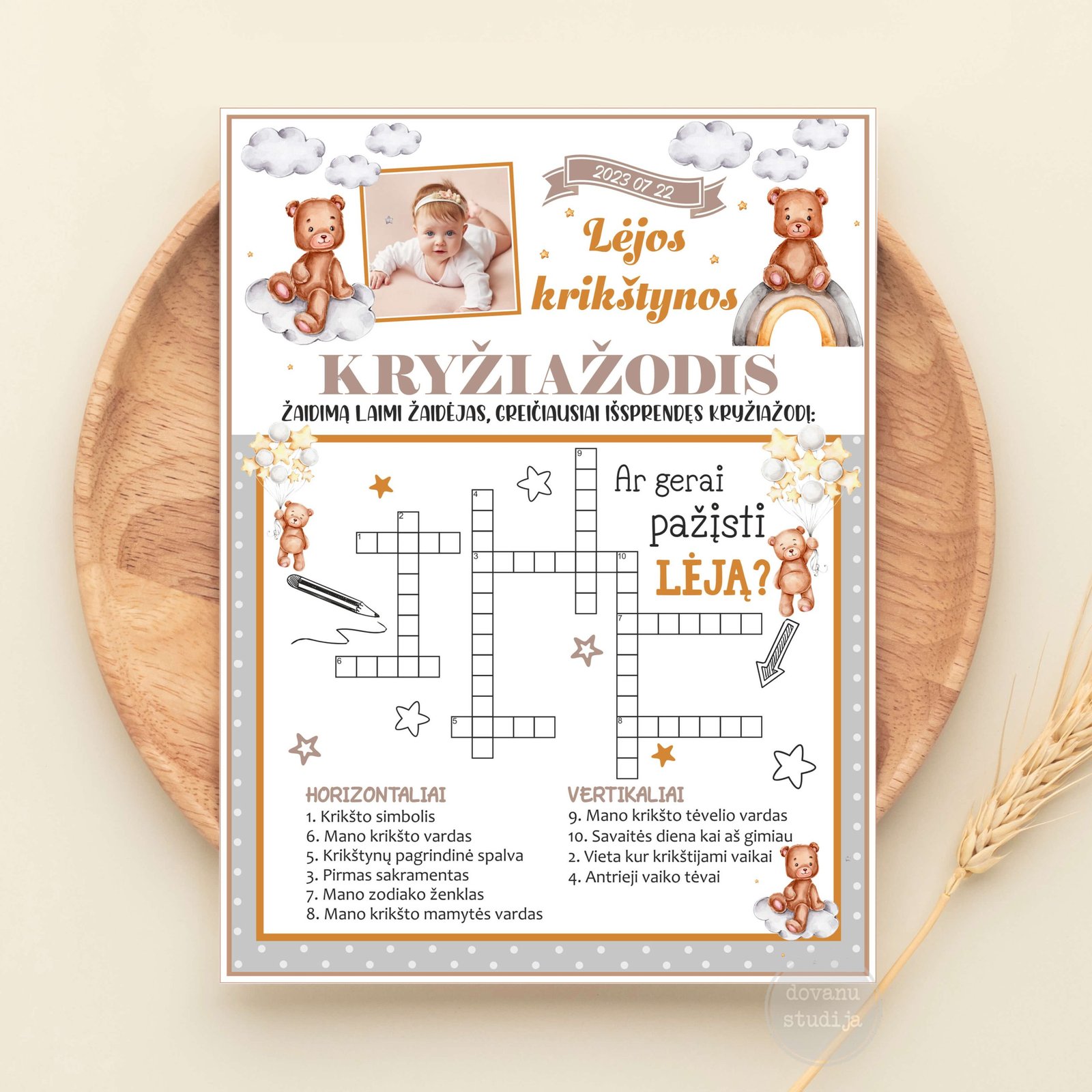 Žaidimas, kurio metu reikia spėti ir įrašyti susijusius žodžius su švente, krikštijamu vaikučiu. Žaidimą laimi, greičiausiai surašęs teisingus atsakymus. Nepamirškite laimėtojo apdovanoti originaliu prizu!