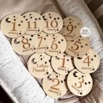 Išskirtinis būdas norintiems įamžinti pirmuosius vaikučio gyvenimo mėnesius ir brangias akimirkas. 13 medinių kortelių: „Labas pasauli!”, „Vienas mėnuo”, „Du mėnesiai”, „Trys mėnesiai”, „Keturi mėnesiai”, „Penki mėnesiai”, „Šeši mėnesiai”, „Septyni mėnesiai”, „Aštuoni mėnesiai”, „Devyni mėnesiai”, „Dešimt mėnesių”, „Vienuolika mėnesių”, „Man jau vieneri”; Dydis: 11 cm;