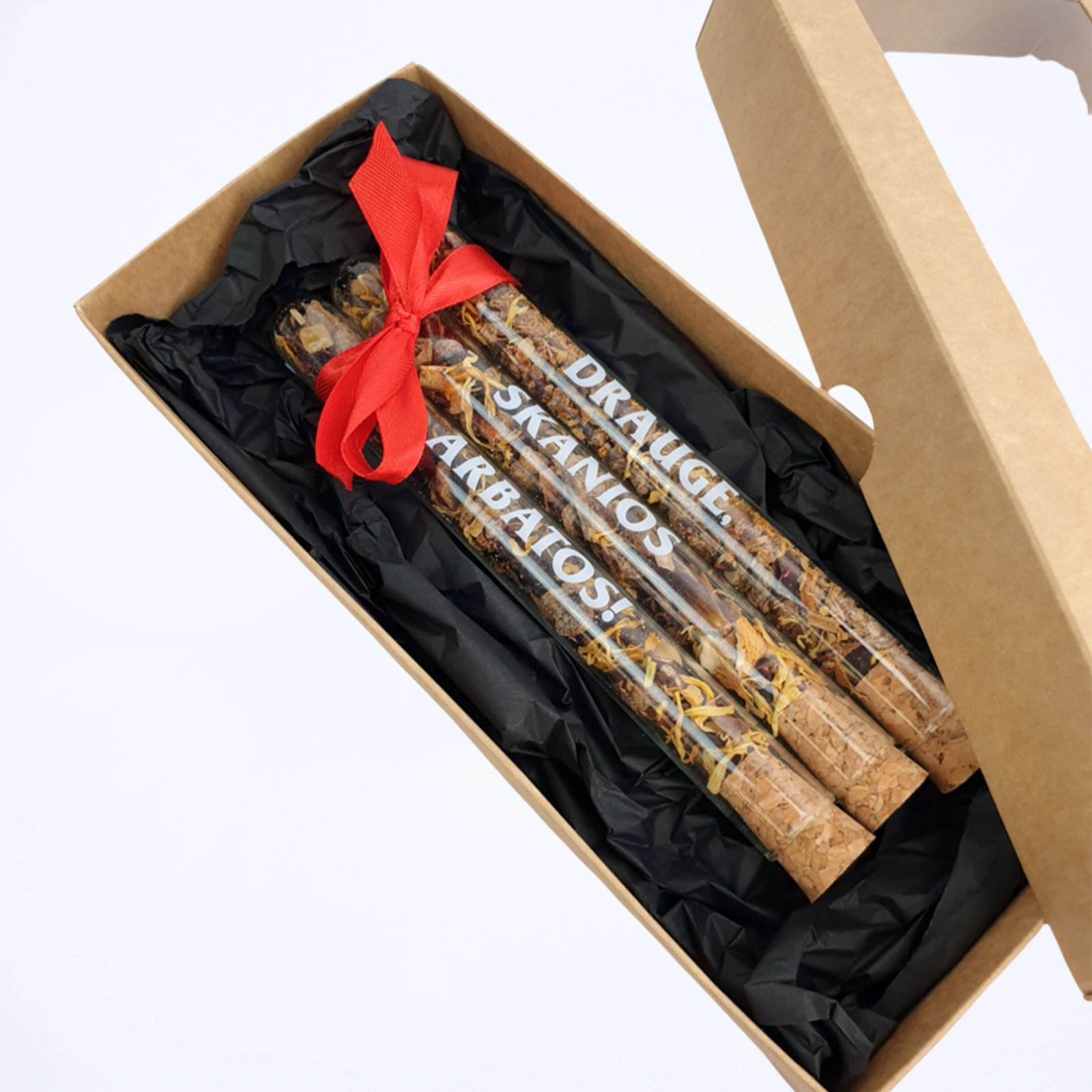 Nedidelė, bet labai jauki dovana – nuostabiausiais aromatais dvelkianti arbata, supakuota į elegantiškus stiklo mėgintuvėlius, suguldytus į dovanų dėžutę.